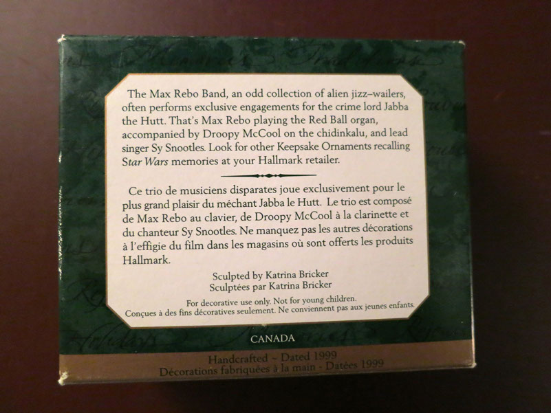 Katrina Bricker sculpted the miniatures set this year: The Max Rebo Band features Max Rebo, Sy Snootles and Droopy McCool from Return Of The Jedi. They are wonderfully detailed for only being about 1" tall each.